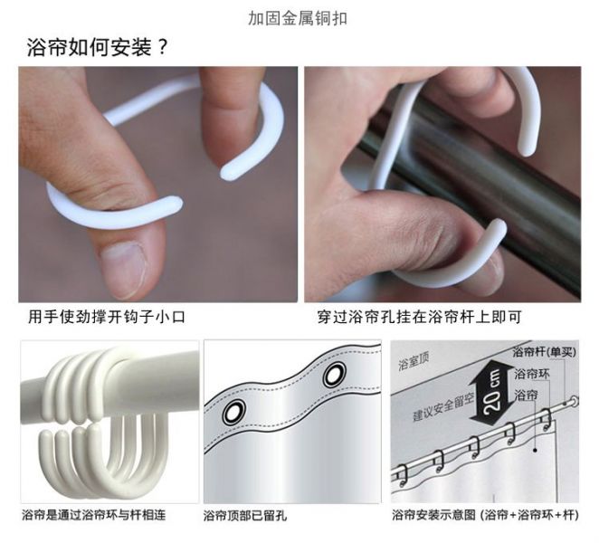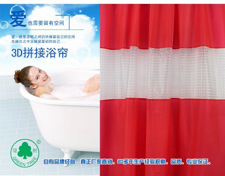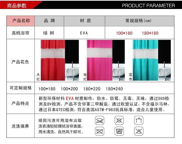 【材質(zhì)】: EVA,環(huán)保,不含鄰苯二甲酸鹽,對人體沒有危害 【規(guī)格】:140*200cm, 170*200cm, 【特點】:浴簾美觀高雅,時尚個性,防水,帶給您非凡的品味生活